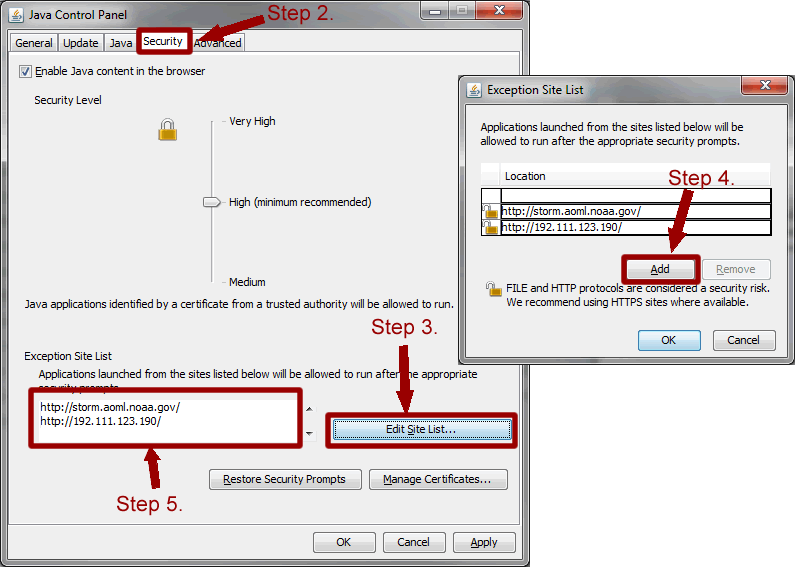 - Verify that the http web address shows up in the "Exception Site List".